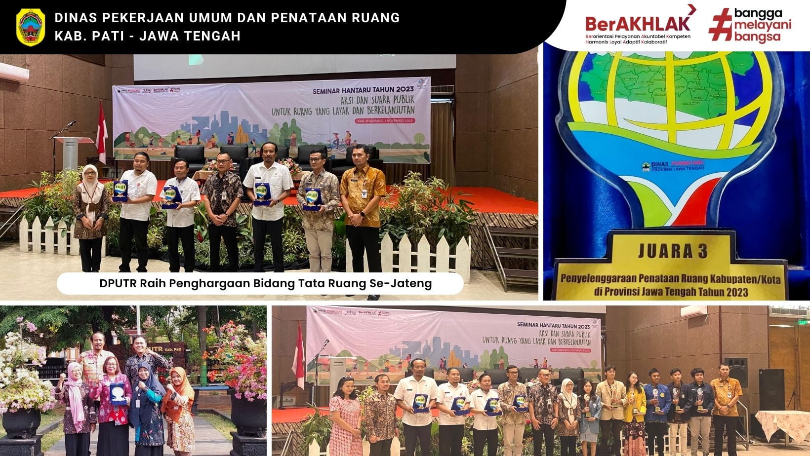 Penghargaan diserahkan Dalam ajang seminar Hantaru tahun 2023 bertajuk “Aksi dan suara publik untuk ruang yang layak dan berkelanjutan” yang digelar di The Wujil resort & conventions Ungaran. DPUTR Kabupaten Pati meraih penghargaan atas kinerja dan inovasi bidang tata ruang wilayah tingkat Jawa Tengah dengan menempati peringkat ke tiga di antara 35 kabupaten/kota.
