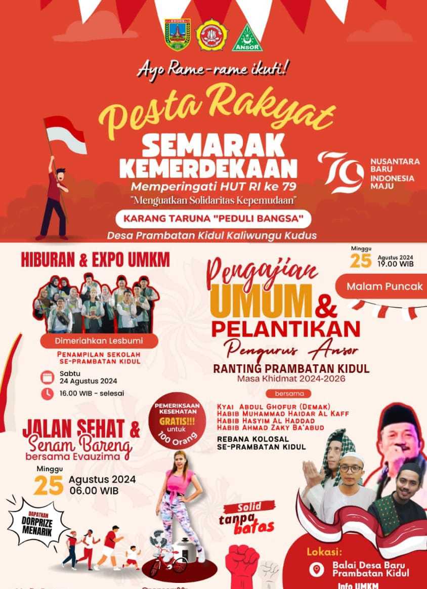 KUDUS – jursidnusantara.com Dalam rangka memperingati Hari Ulang Tahun Republik Indonesia (HUT RI) Ke-79 Pemerintah Desa (Pemdes) Prambatan Kidul, Kecamatan Kaliwungu, Kabupaten Kudus menyelenggarakan berbagai kegiatan mulai Expo UMKM, Jalan Sehat, dan berbagai hiburan Kesenian.