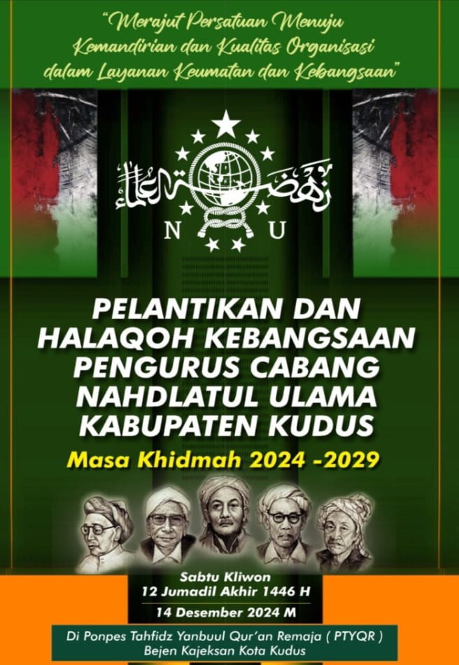 “Pelaksanaan pelantikan PC NU Kudus dan Halaqoh Kebangsaan kami laksanakan besuk Sabtu (14/12/2024) bertempat di Pondok Pesantren (Ponpes) Tahfudh Yanbu’ul Quran Remaja (PTYQR), Bejen, Kajeksan, Kecamatan Kota, Kabupaten Kudus,” katanya.