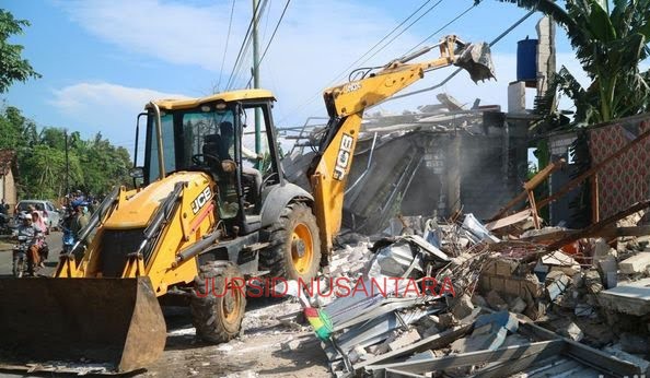 Terdapat dua alat berat yang digunakan untuk meratakan bangunan tersebut.Pemilik warung yang berada di lokasi terlihat mengambil barang-barang yang masih bisa digunakan, dan nampak mereka pasrah dengan pembongkaran asetnya tersebut.