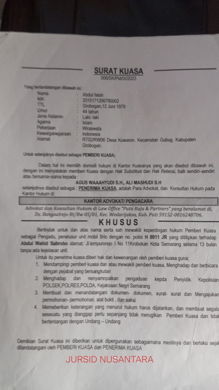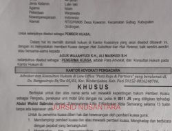 Grobogan,– jursidnusantara.com Polemik dugaan kuasa palsu yang sempat viral dalam pemberitaan sebelumnya kini memasuki babak baru. Setelah dituding menggunakan surat kuasa palsu untuk melakukan tindakan penipuan dan penggelapan, oknum pengacara Ali Mashudi yang sebelumnya dilaporkan oleh Abdul Fatah akhirnya menunjukkan adanya surat kuasa yang disebut sebagai dasar tindakan hukumnya.