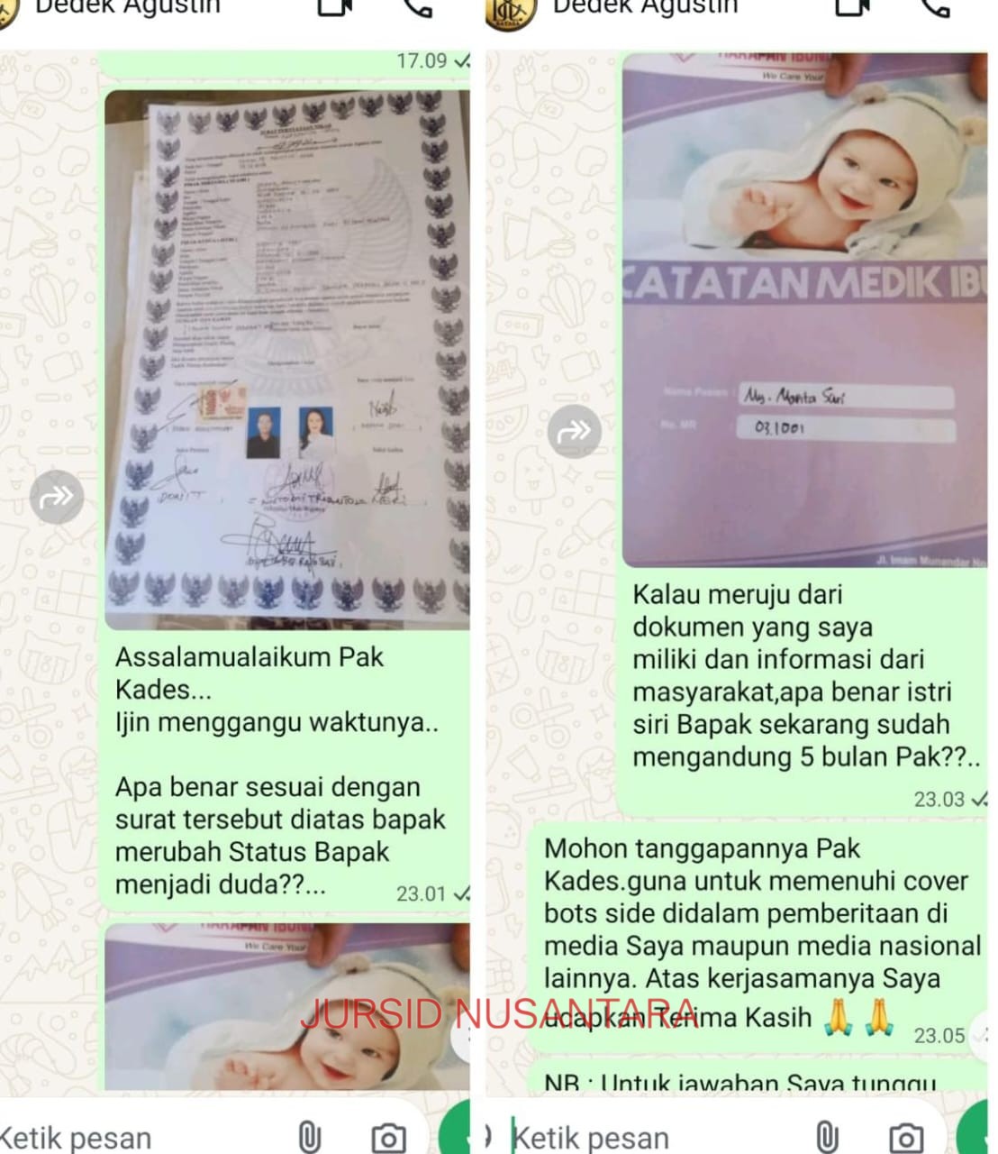 Berdasarkan informasi yang diterima wartawan, Kades Sumber Sari yang masih memiliki istri sah, disebut-sebut telah mengklaim dirinya sebagai duda dalam proses akad nikah siri dengan NS. Klaim status duda tersebut tercantum dalam salinan surat nikah siri yang kini telah beredar luas di kalangan masyarakat, sehingga memicu gelombang reaksi dan sorotan tajam terhadap integritas moral kepala desa tersebut.