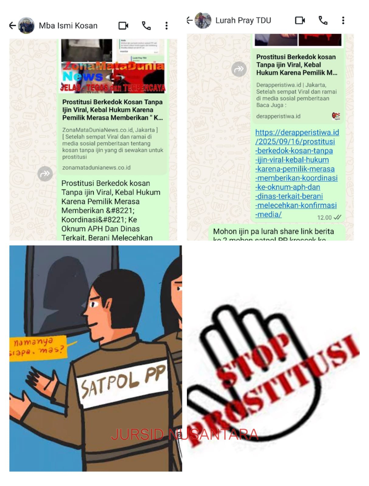 Lurah Tanjung duren Utara Pray sudah dua kali di berikan laporan dan share link berita oleh tim 9 investigasi media bahwa ada kosan di RT 05 RW 01 dan RT 06 RW 01 tanpa ijin dan di gunakan untuk prostitusi terselubung, pengelola dikenal dengan sebutan mba is. Sampai hari ini Selasa malam 16 September 2025 belum ada crosscek ke lokasi dari satpol PP kelurahan TDU seperti jawaban pa lurah bahwa hari ini sudah mengarahkan satpol PP untuk cek lokasi. Ini menimbulkan pertanyaan besar di masyarakat bahwa tidak adanya pengecekan oleh satpol PP kelurahan Tanjung duren Utara karena Di duga sudah menerima koordinasi bulanan dari mba is. Hal ini perlu di croscek kebenarannya.