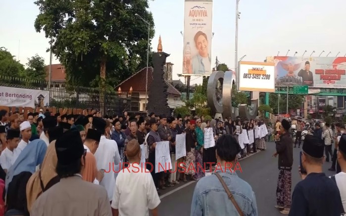 KUDUS – jursidnusantsra.com Ratusan santri dari berbagai pondok pesantren (Ponpes) di Kabupaten Kudus menggelar aksi damai di depan Pendopo Kudus pada Selasa, 14 Oktober 2025.