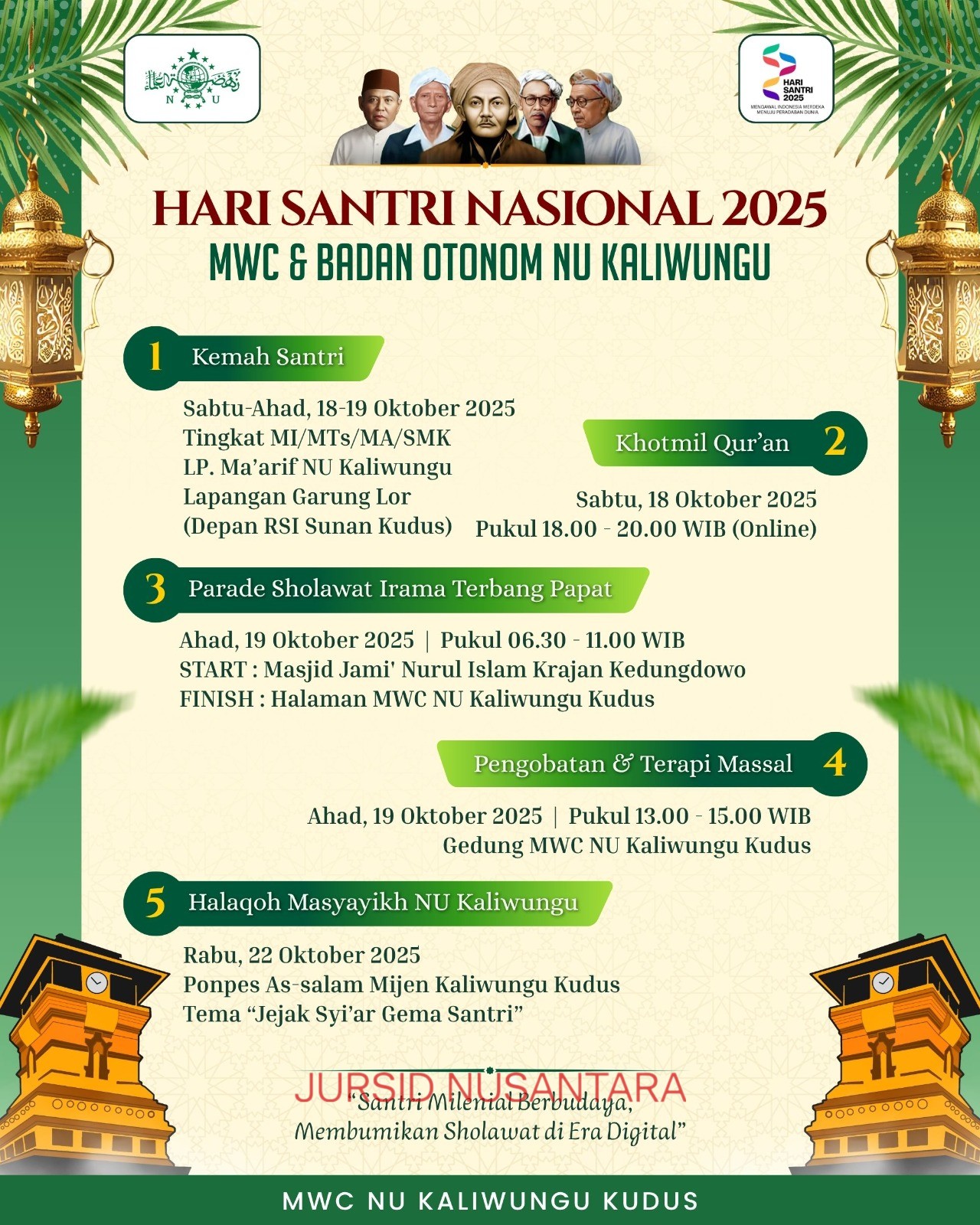 KUDUS – jursidnusantara.com Menyambut peringatan Hari Santri Nasional (HSN) tahun 2025 Majlis Wakil Cabang (MWC) Nahdlatul Ulama (NU) dan Badan Otonom Kaliwungu Kudus akan menggelar berbagai kegiatan mulai dari Kemah santri, Parade Sholawat Irama Terbang Papat hingga Halaqoh Masyayikh NU Kaliwungu.