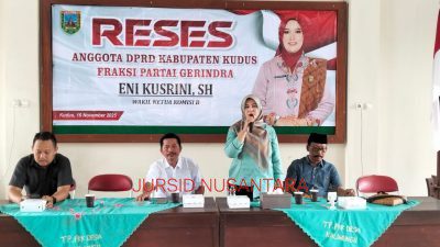 KUDUS – jursidnusantara.com Anggota Dewan Perwakilan Rakyat Daerah (DPRD) Kabupaten Kudus dari wakil ketua Komisi B Eni Kusrini, SH., melaksanakan kegiatan reses sebagai upaya menjaring dan menyerap aspirasi masyarakat di…